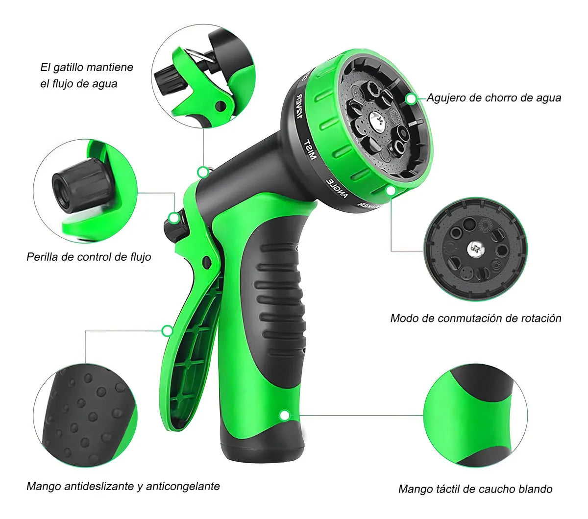 Boquilla De Seguridad De 10 Funciones - En comparación con la mayoría de las boquillas de manguera de 9 patrones, nuestra boquilla de agua con 10 patrones para más opciones. El revestimiento exterior de goma es antideslizante y cómodo. Bisel giratorio para elegir fácilmente el tipo de boquilla. Hebilla para un uso ininterrumpido. Empuñadura ergonómica para un manejo sin esfuerzo. Podrá sentir la calidad en el instante en que coja la manguera de jardín extensible de 100ft.